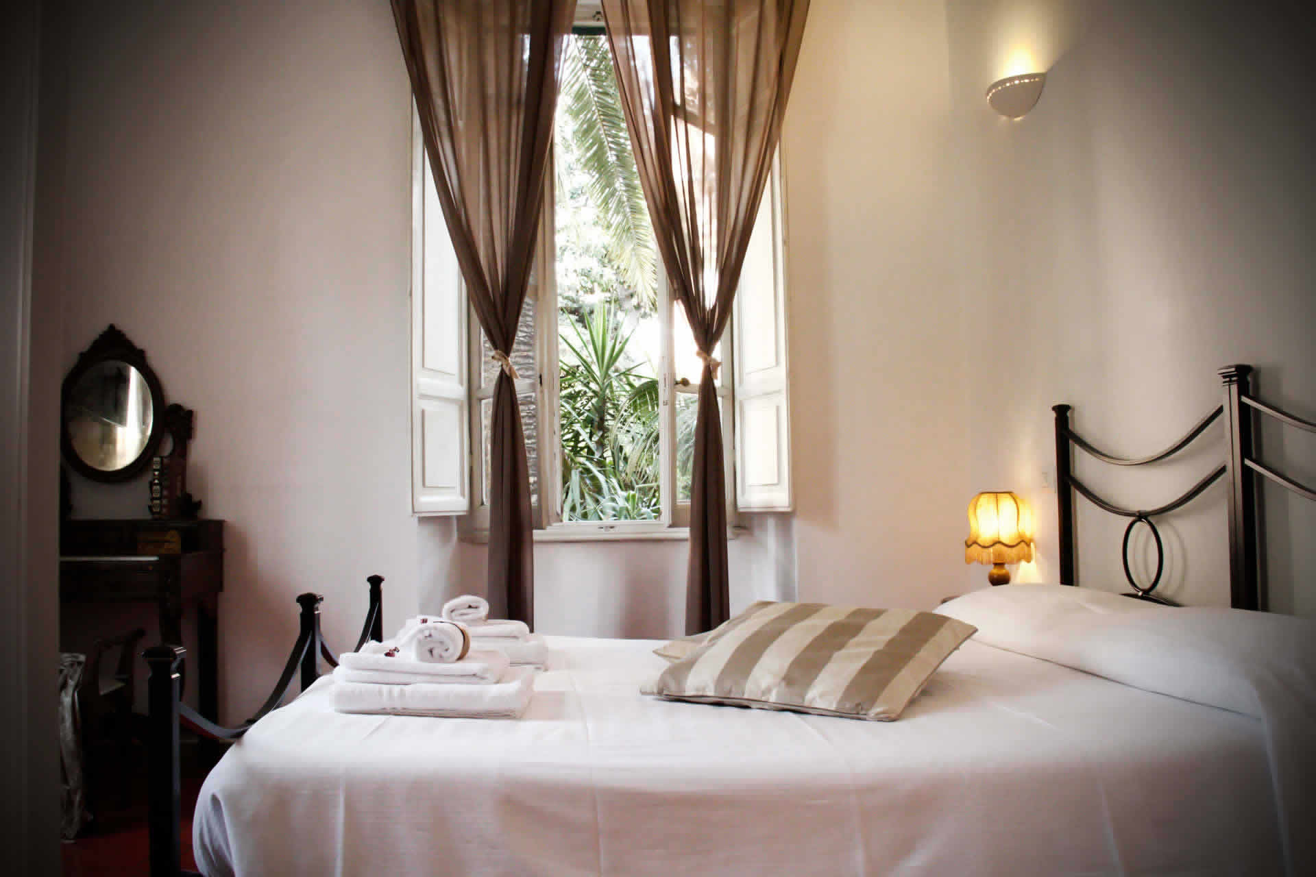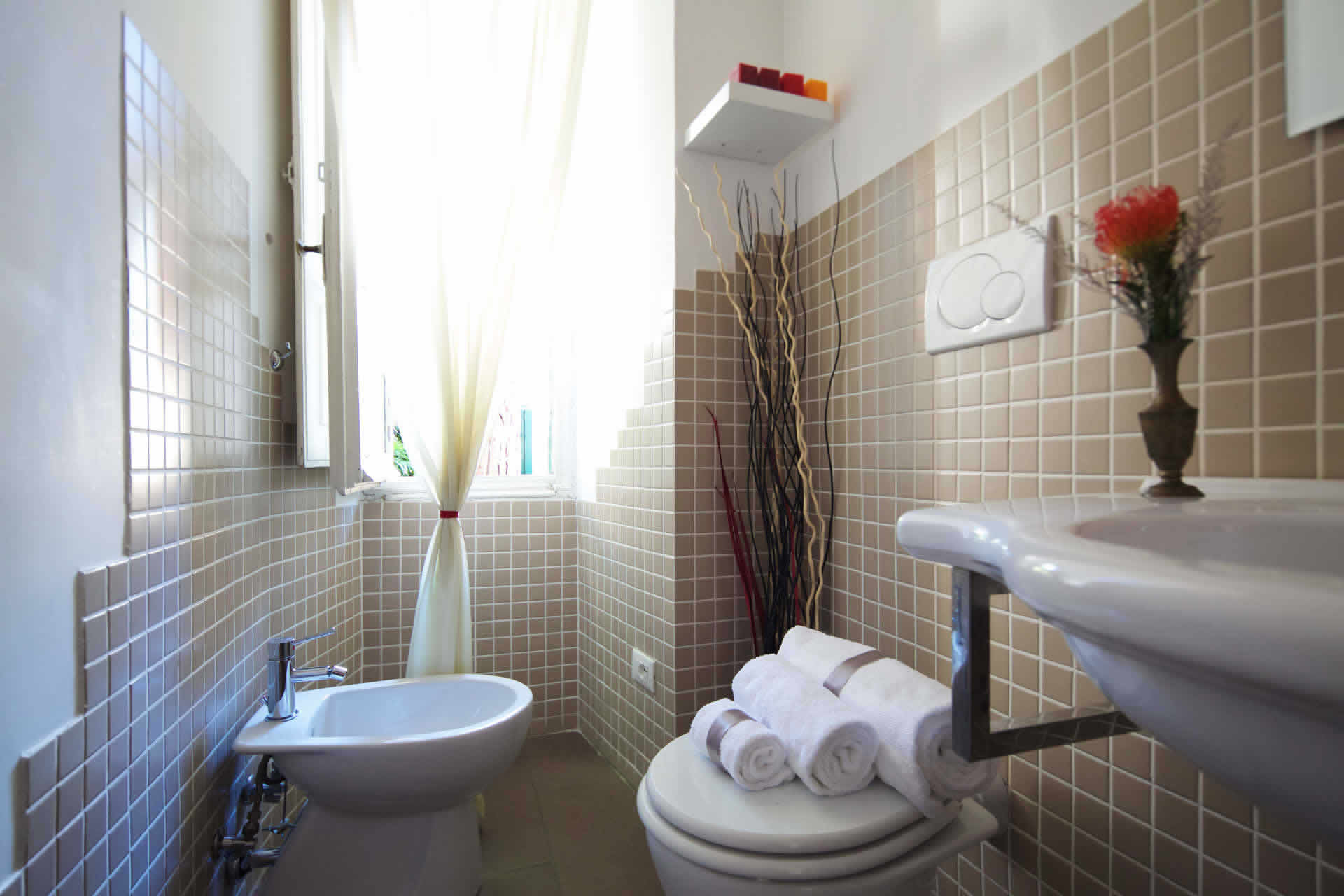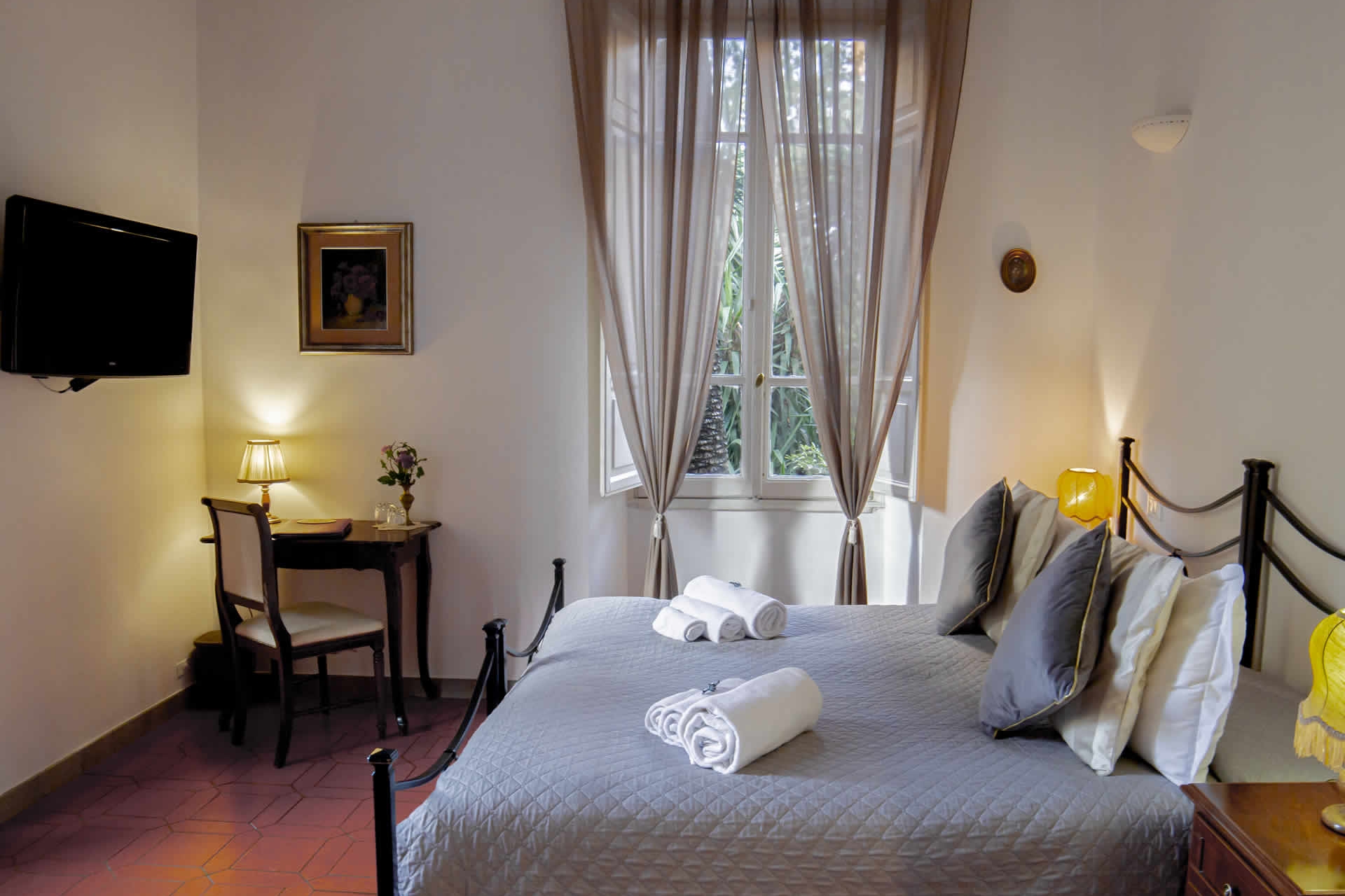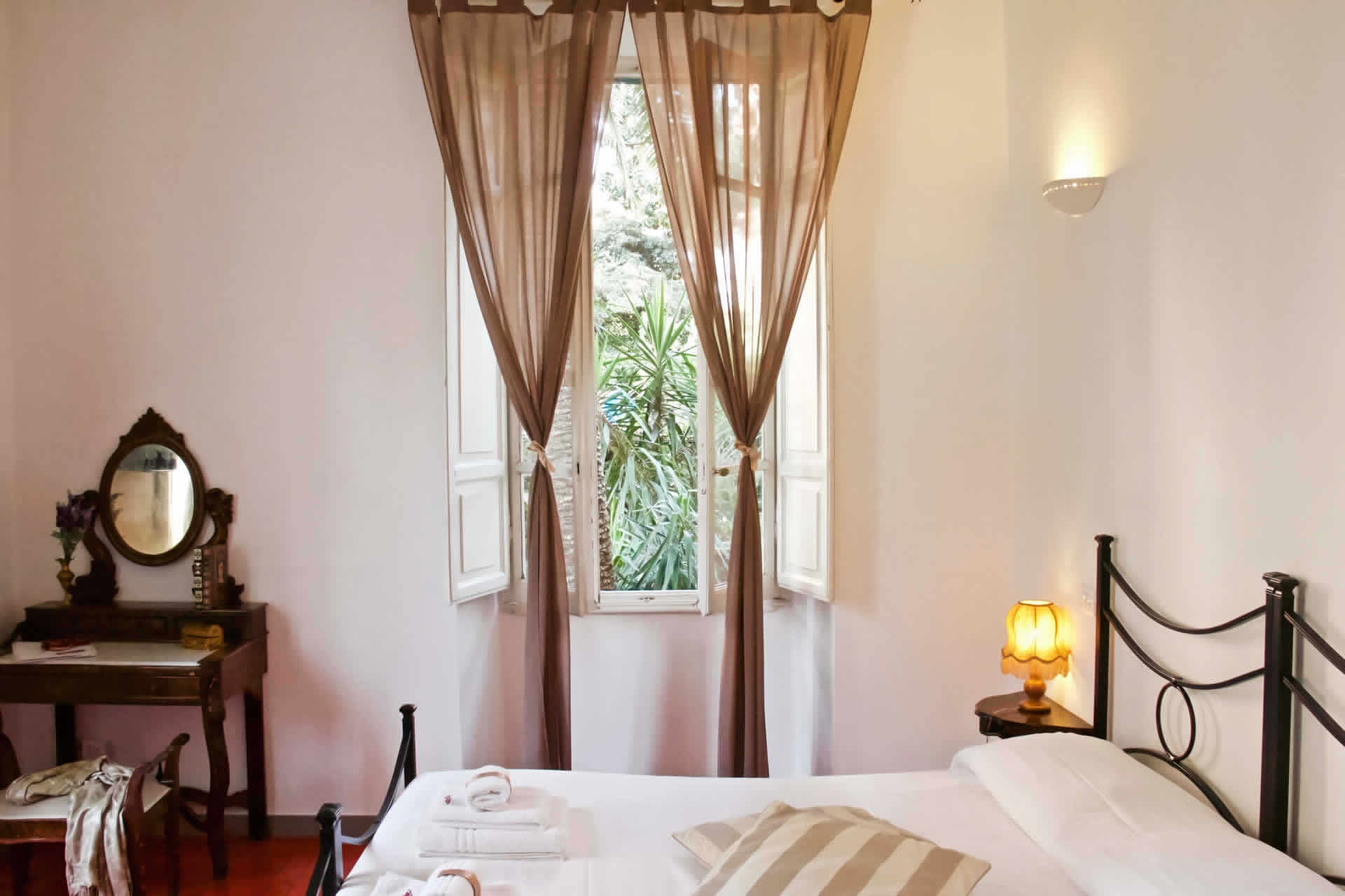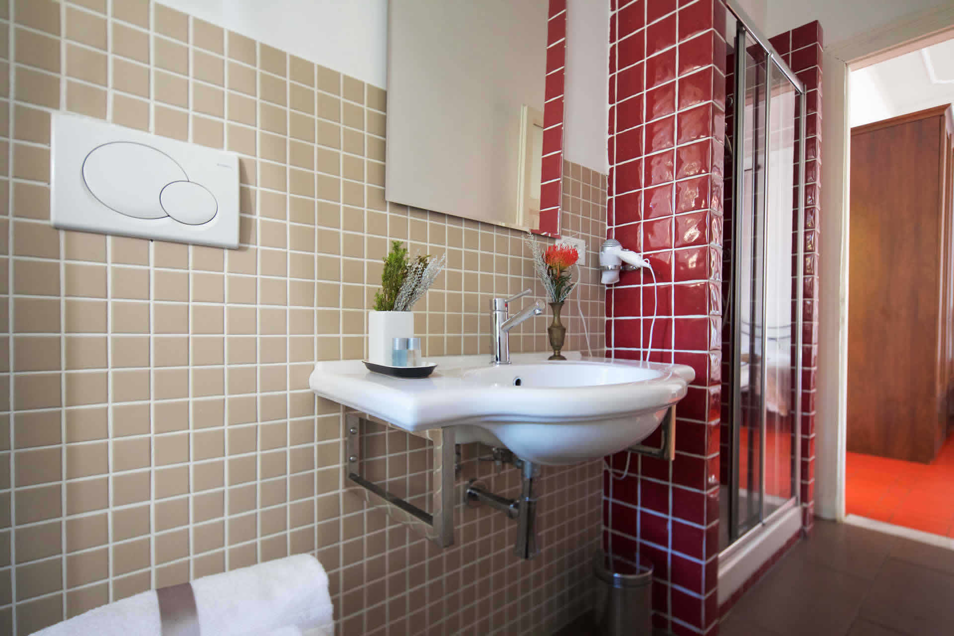 En la planta baja, rodeada por el jardín, se encuentra la sala más grande que también se puede dividir en dos habitaciones dobles con la posibilidad de agregar dos camas individuales adicionales. Equipado con dos servicios internos, es adecuado para familias y grupos de amigos. Grandes y luminosas con tonos rojos y topo. Astrea y Artemide también se pueden vender por separado